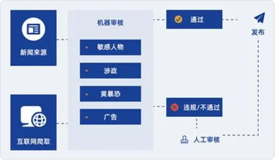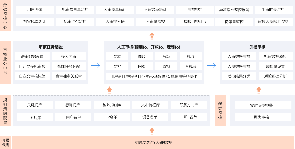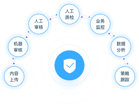 內(nèi)容上傳(API/在線檢測多種方式快速接入)-機器檢測-人工審核(一審二審三審自由配置)—人工質(zhì)檢-業(yè)務(wù)監(jiān)控-數(shù)據(jù)分析-策略跟蹤,全流程溯源,保障內(nèi)容安全