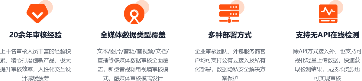 文本、圖片、音視頻、直播、文檔、網(wǎng)頁等融媒體數(shù)據(jù)審核全覆蓋